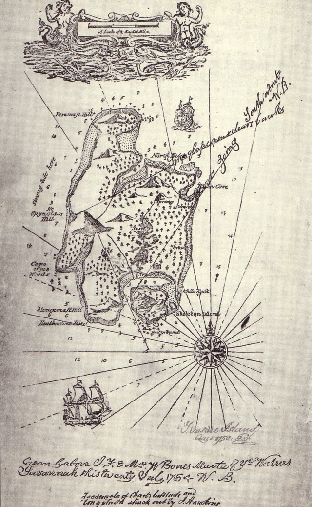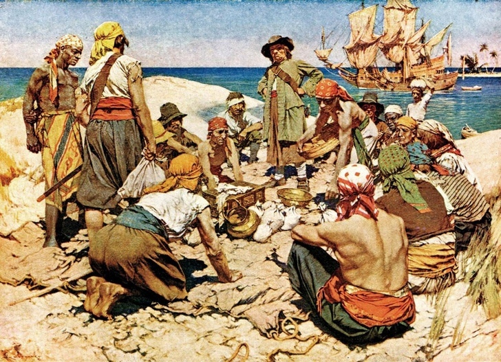 Со словом «пират» ассоциируются также представления о богатой добыче, ларцах с драгоценными камнями, сундуках, набитых золотыми вещами, мешками монет, спрятанных в тайниках, в не доступных никому местах или зарытых на пустынном берегу реки или неисследованном морском побережье, под скалами или деревьями, которые помечены таинственными знаками, подсказывавшими, где хранится сокровище. Пираты всегда стремились спрятать или зарыть свою добычу, но, поскольку их жизнь была полна опасностей и они частенько погибали или попадали в плен, почти никто из них не появлялся на этом месте снова. Огромные сокровища оставались лежать в земле, и след их часто терялся. Многие люди пытались отыскать эти сокровища; они без устали копали землю, предвкушая, как лопаты начнут выбрасывать на поверхность золотые слитки, алмазные кресты и сумки с золотыми дублонами или наткнутся на крышку сундука, набитого мойдорами (старинными португальскими монетами), дукатами и жемчугом. Да, земля хранит много зарытых сокровищ, но мало кому удается их отыскать.»