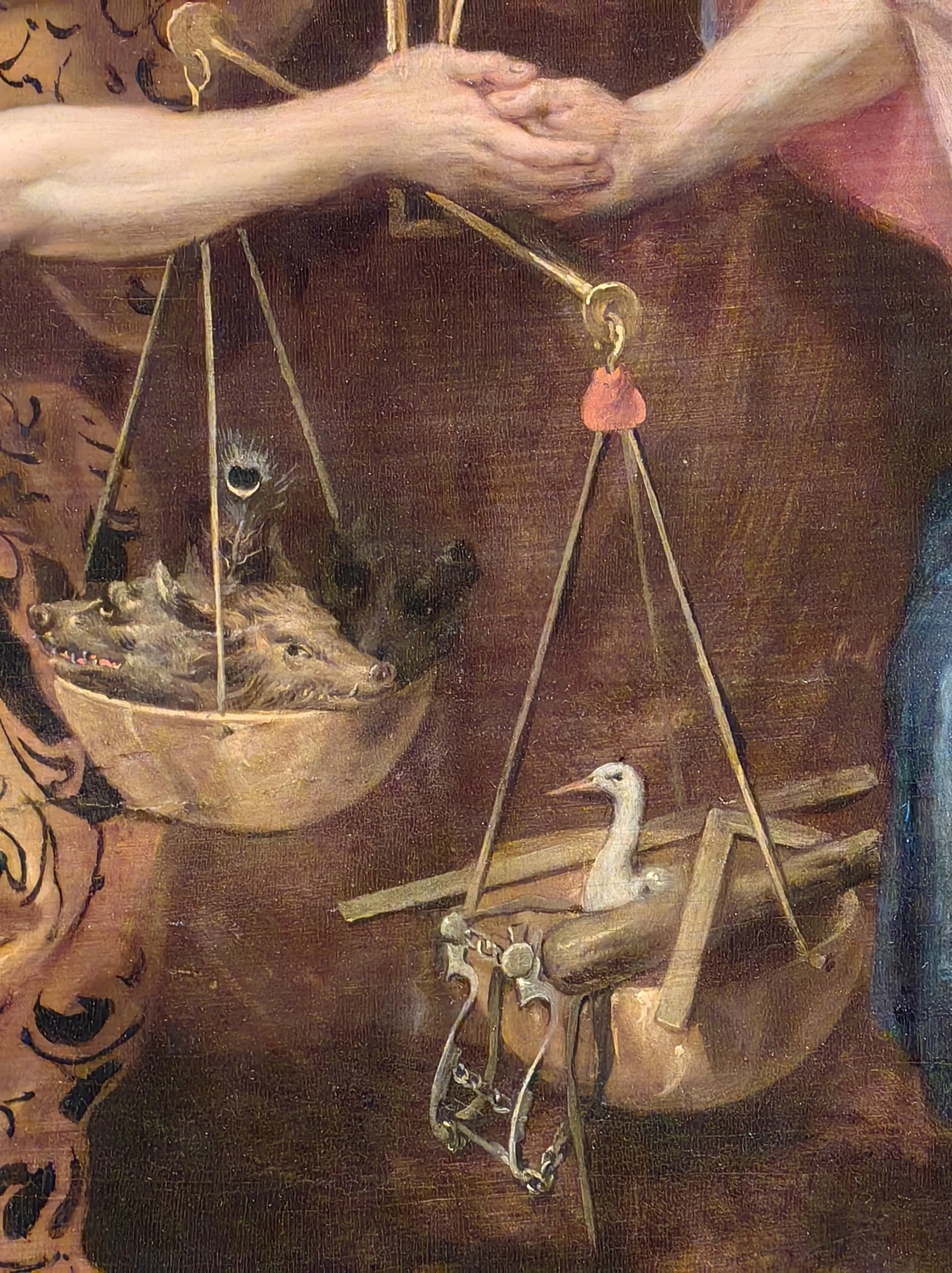 На картине судья (слева) взвешивает душевные качества мужчины (справа, по центру картины, похож на Рубенса) на весах.