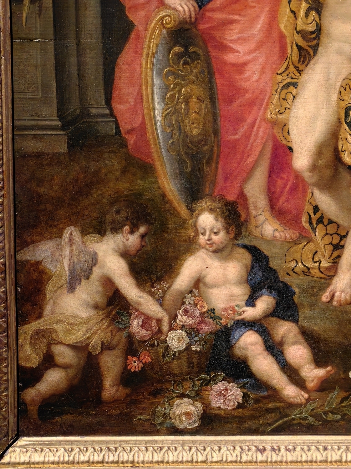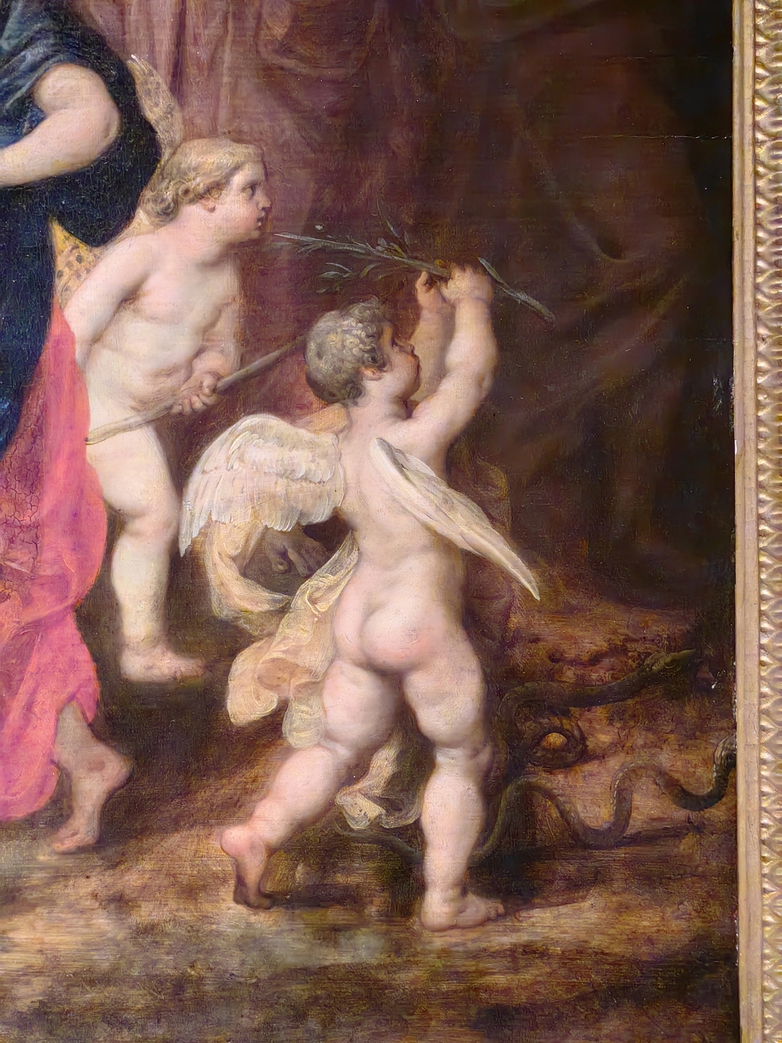 Ангелочек-путти сверху готов возложить венок на голову главного героя. А внизу путти мастерят веночки, и один уже готов. Для кого он? Не для нас ли, тех, кто разгадывает загадки аллегорий добродетельной жизни? Мы ведь тоже можем... Сперва, конечно, разгадав тайну линейки и угольника... Подумать о себе: а мы достойны таких наград - изобилия, защиты, любви? Преобладают ли у нас добродетели, перевешивают ли чашу со злобой, алчностью и гордыней? Если перевешивают, то вот он и венок - готов. Для нас. Один венок готов, следующий уже путти собирают на наших глазах.