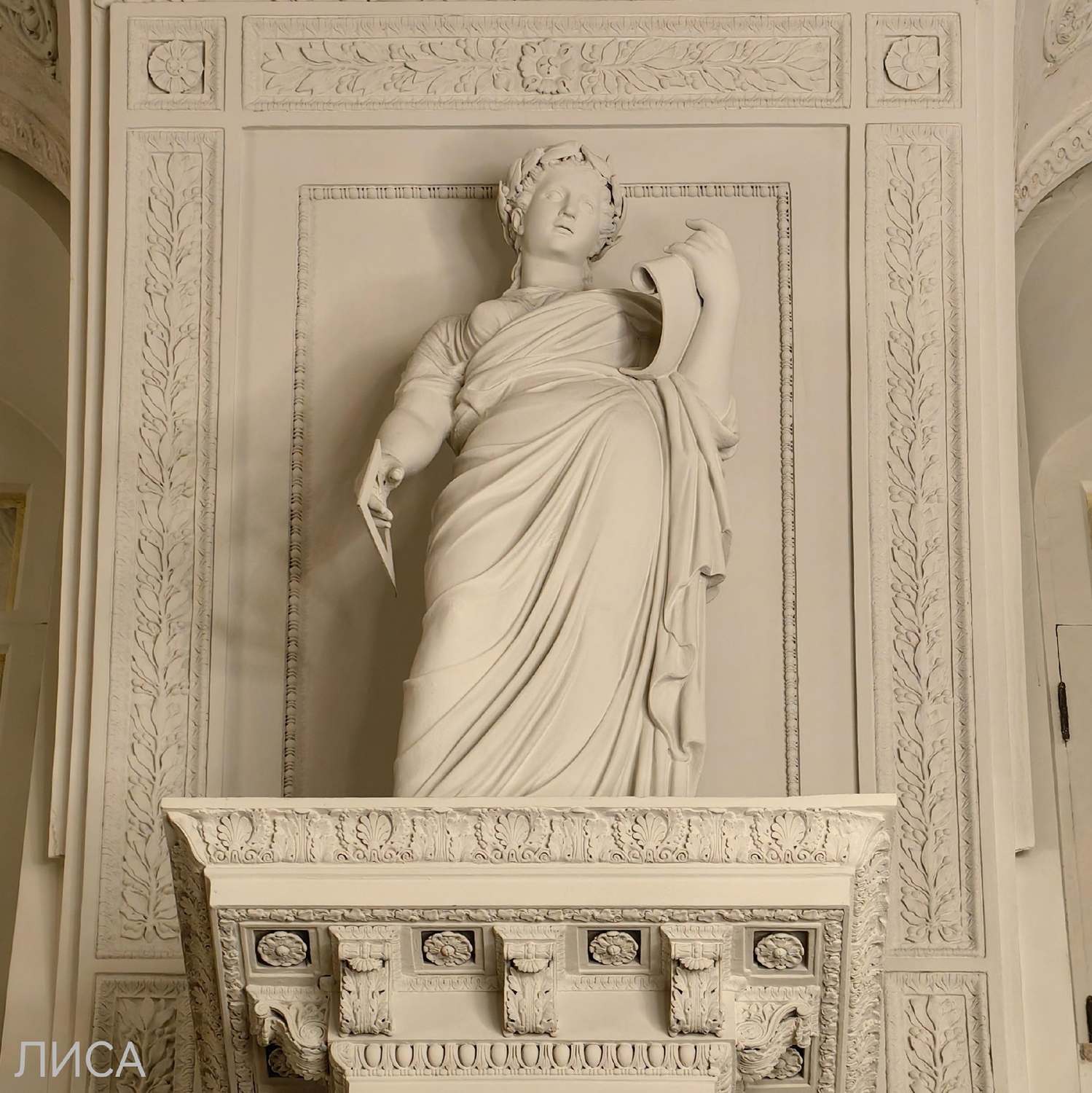 Эрмитаж. Белый зал (зал №289) создан по проекту А. П. Брюллова (1839). Над колоннами расставлены женские фигуры, символизирующие различные виды искусства. Угольник в руках... у музы геометрии?