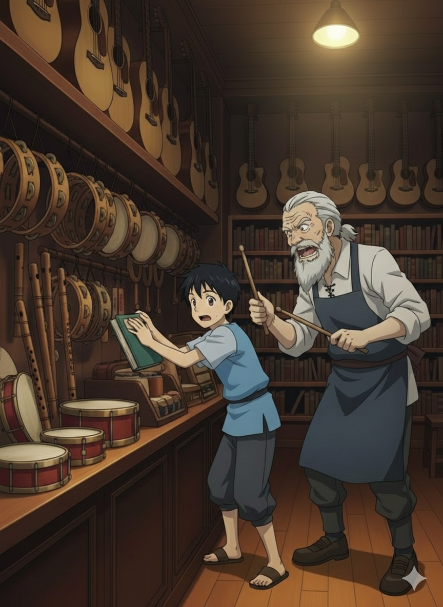 Он спрятал учебник среди музыкальных инструментов. Торговец стал стучать по учебнику палочками, учебник издавал глухие звуки. «Эй, юноша, - закричал торговец, это плохой барабан, забери!»