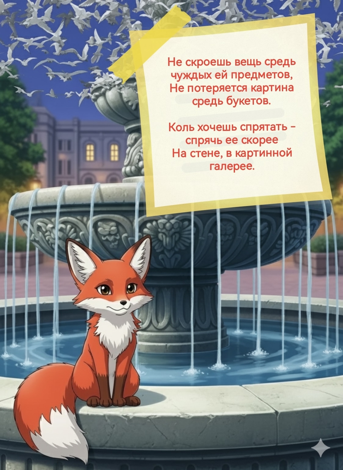 — Ты открыла мне глаза, мудрая лисичка. Теперь я понял: если хочешь спрятать вещь, не прячь её в случайном месте. Найди множество, которому эта вещь принадлежит, и тогда она затеряется среди себе подобных.