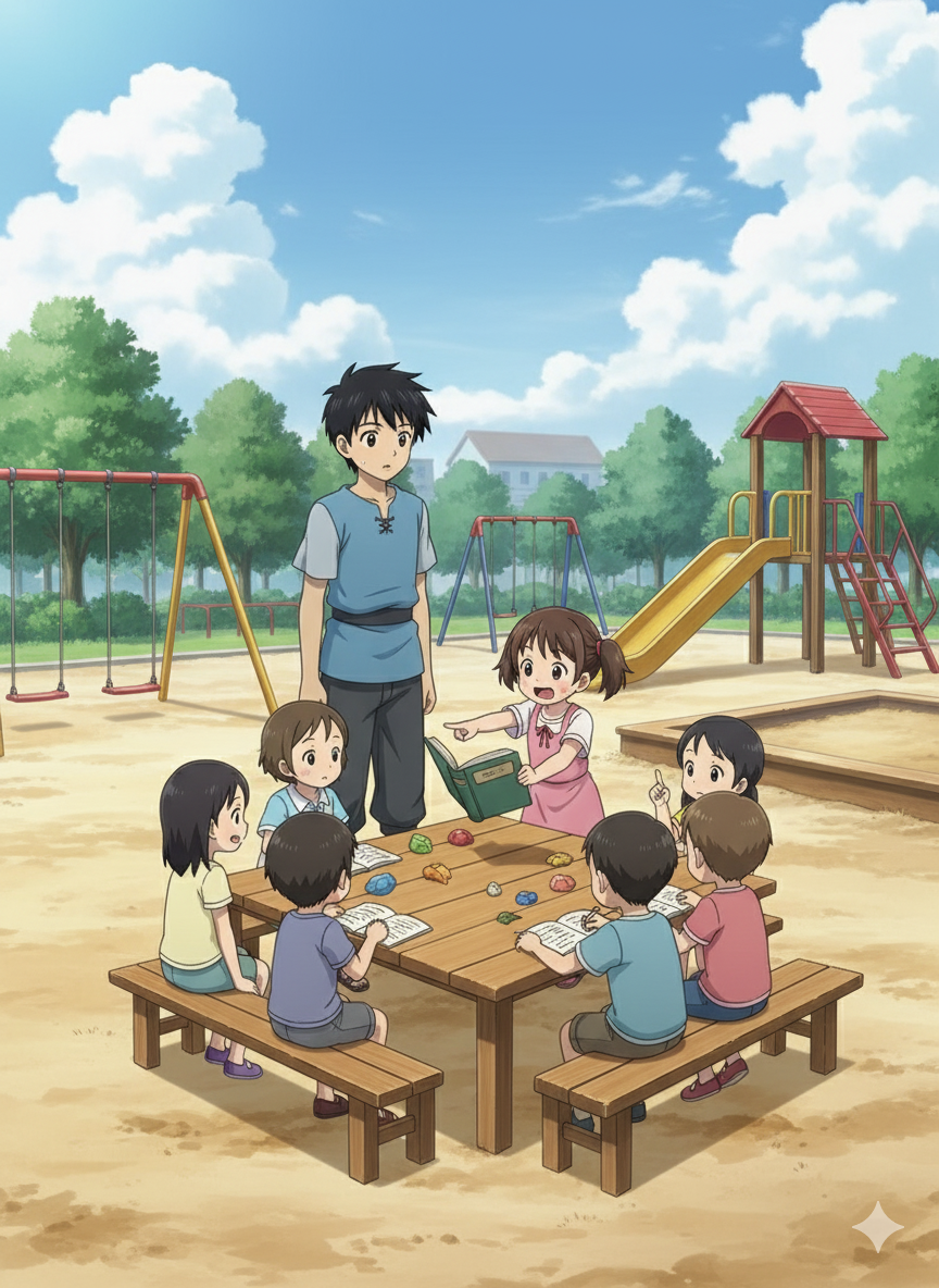 Тогда он спрятал учебник на детской площадке. Но дети нашли учебник и сели играть в «школу».